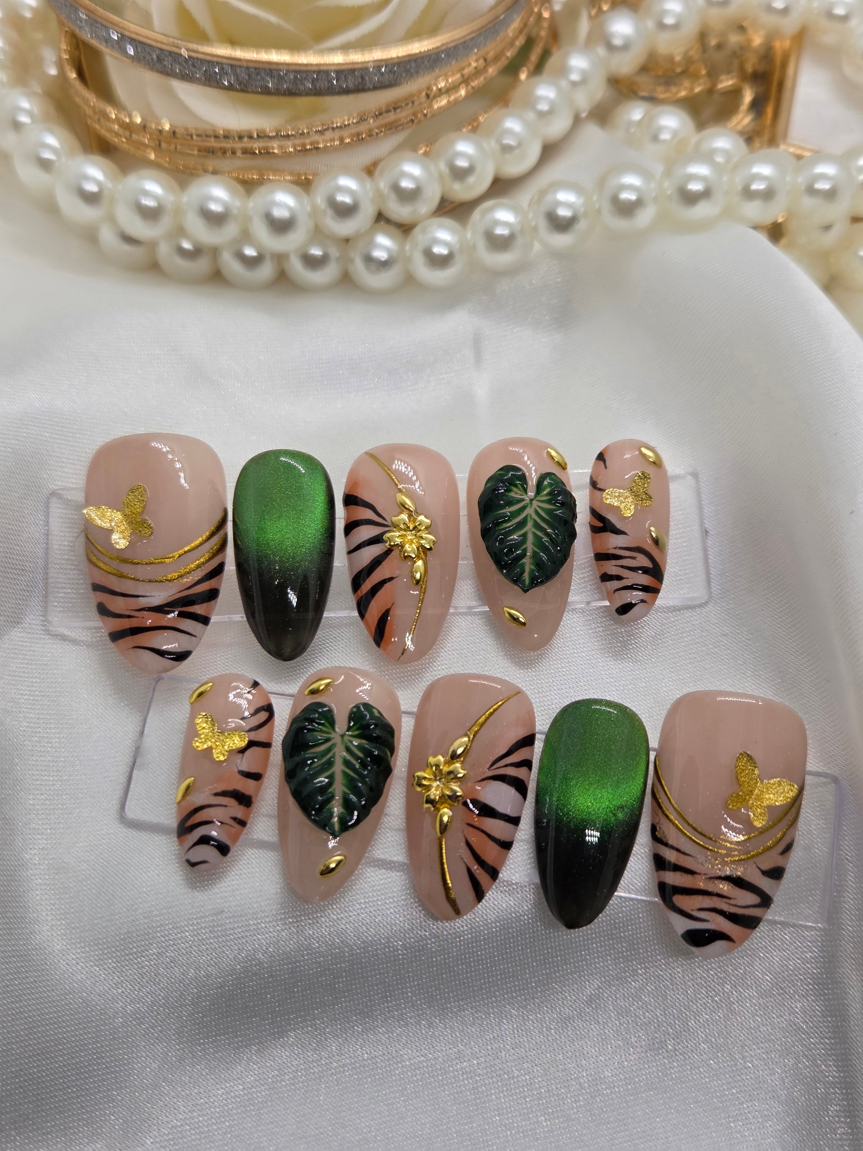Welcome to paradise! All nail sets are buffed, cleaned, and cured with a gel base coat at the start of designing. Then finished with a top of the line top coat that'll keep your nails shiny and glossy until you're ready for the next set. These nails are reusable depending on adhesive/removal. All orders will come with a prep kit which includes Curve Life semi-solid glue, a scented cuticle oil, a sheet of sticky tabs, mini file, buffer, cuticle stick, alcohol wipes, application/aftercare instruction card. If you have any questions, please message us from the contact box and we'll get right back to you. Processing time is 1-5 business days(majority 2 days) and delivery may be 1-14 business days days. Have fun shopping and we can't wait to make your nails beautiful!