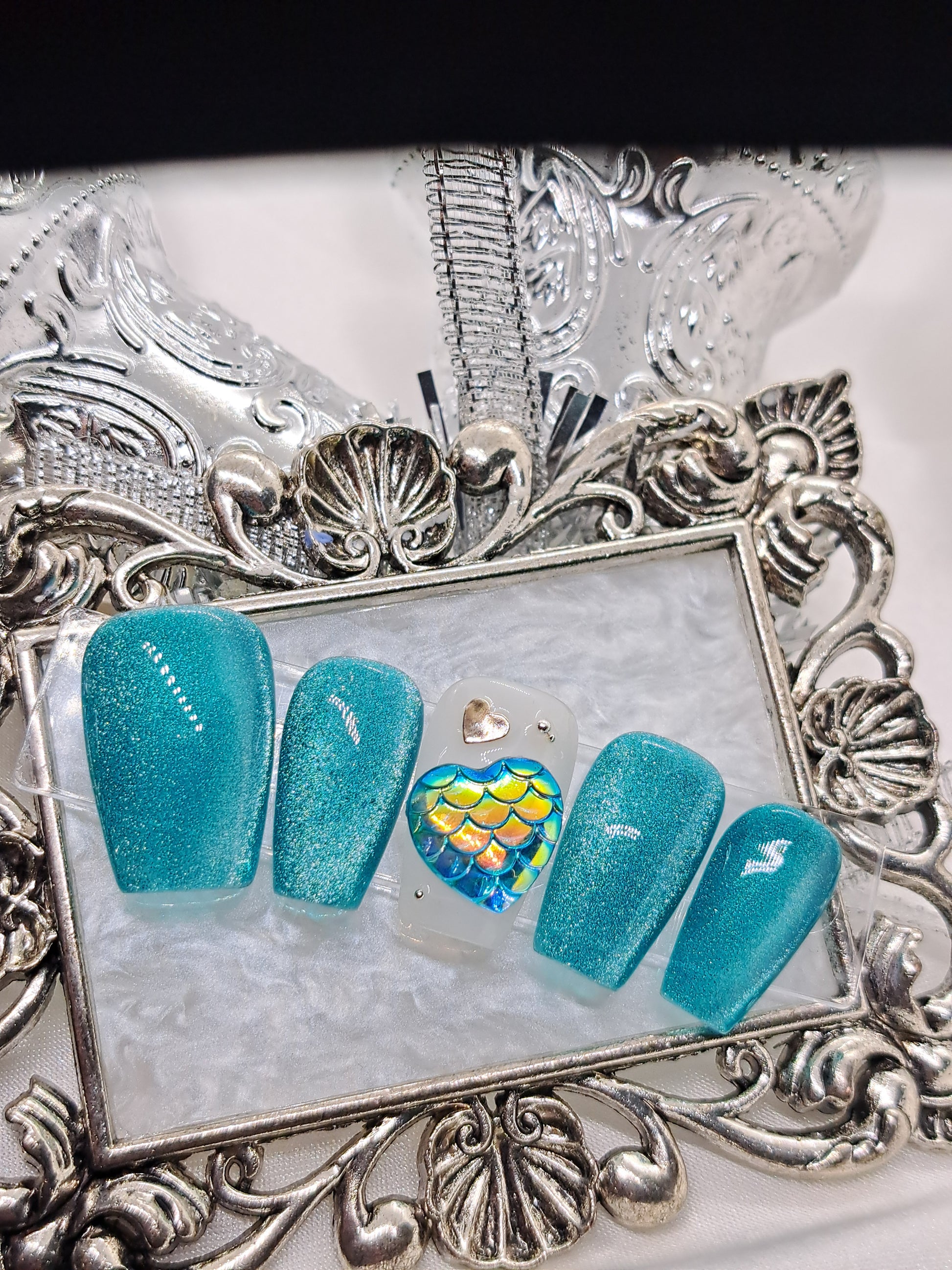"A Love Waiting To Be Discovered" These nails provide a beautiful greenish-aqua stunning cat eye design with a touch of playfulness. Indulge in the benefits of a secret love with these stunning nails.4
