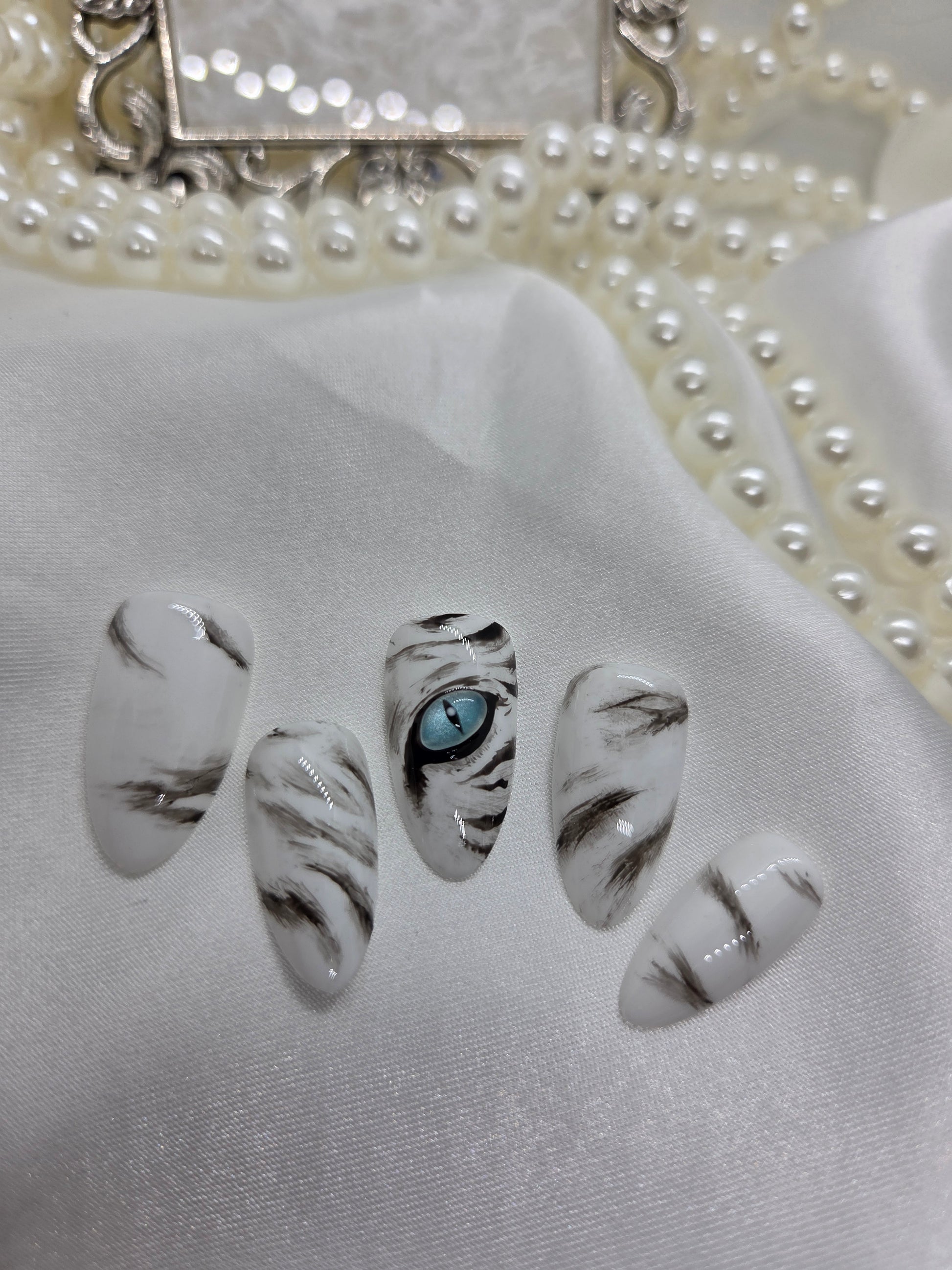 Cold as ice and twice as regal. This press on nail set features hand-painted white tiger artistry, anchored by a piercing sapphire mystic eye that demands attention. Designed for those who rule with a quiet, lethal elegance.