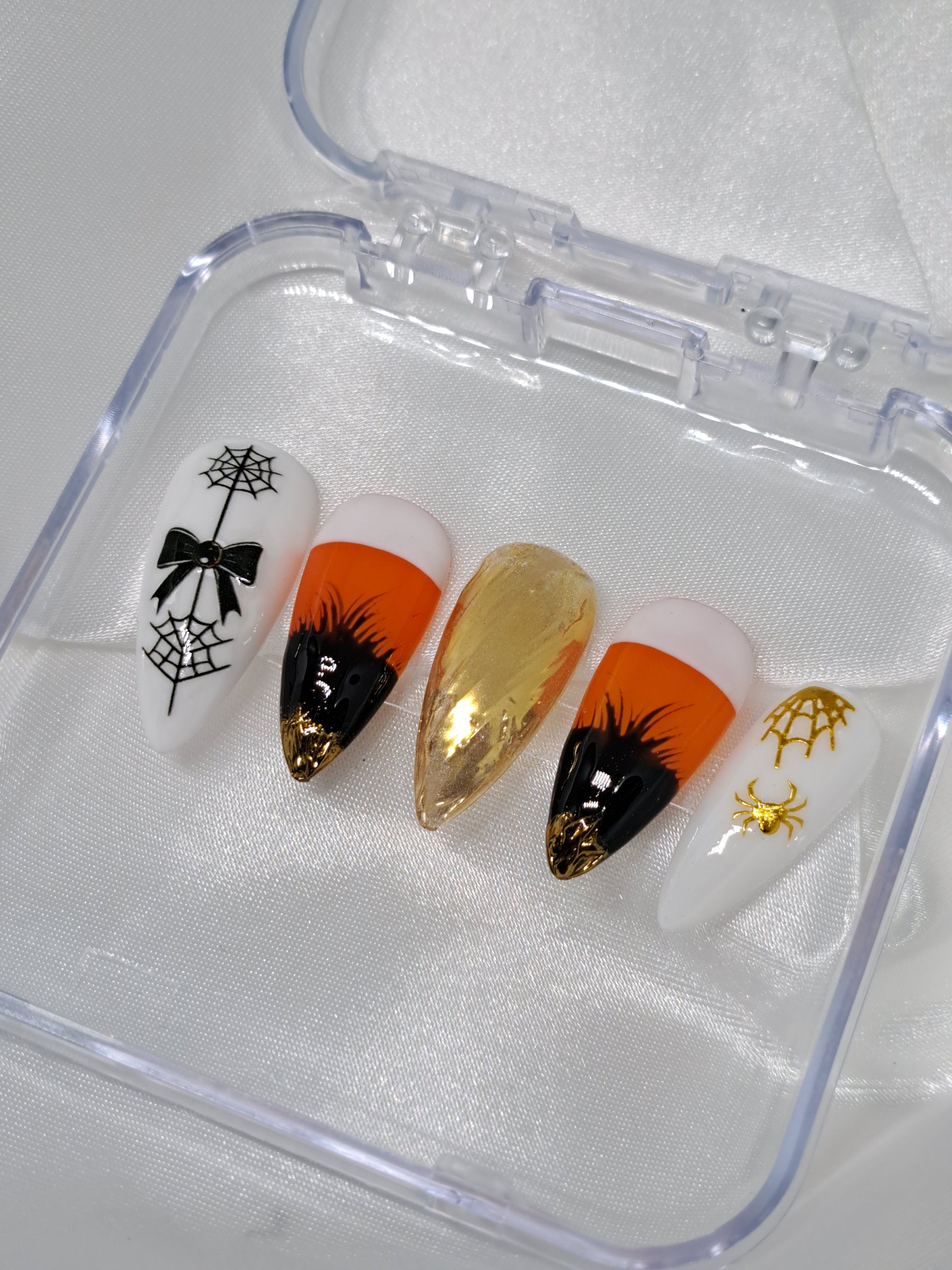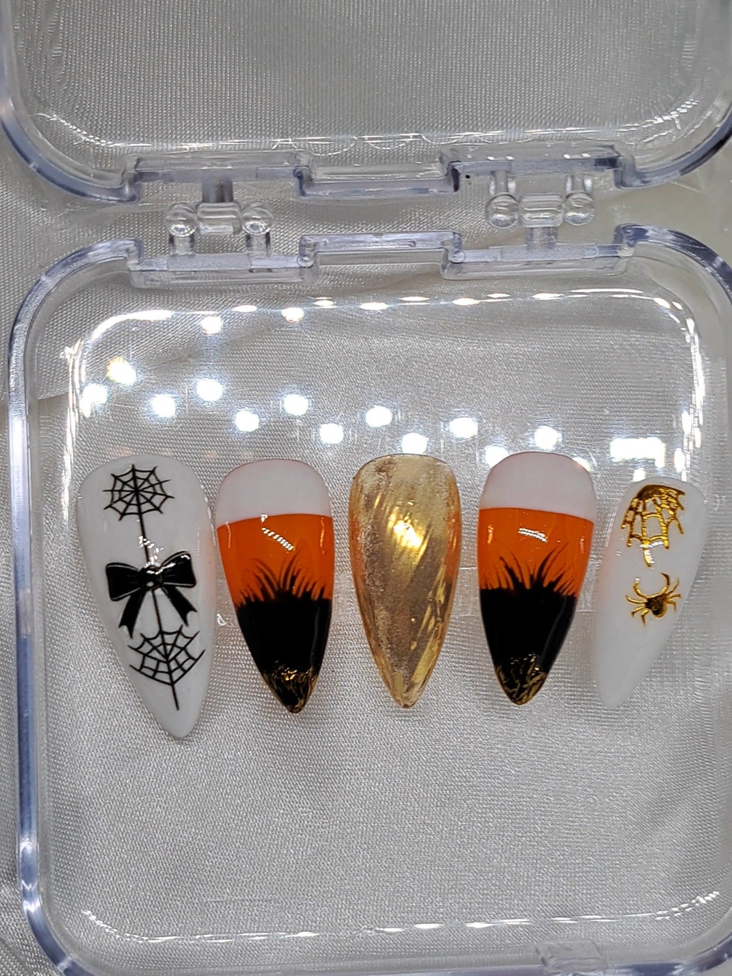 Candy corn themed with a rustic gold middle finger. Thumb decals will vary depending on the length you choose