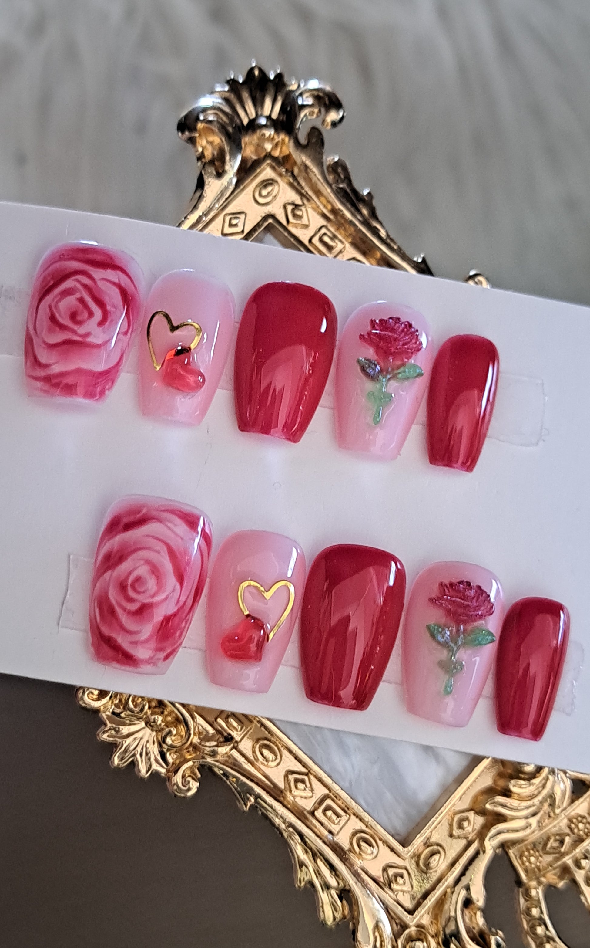 Mon Amour is a romantic press-on nail set designed for easy application and a polished appearance. With its elegant design, users can achieve a sophisticated look without the need for a salon visit, making it an efficient option for nail care.