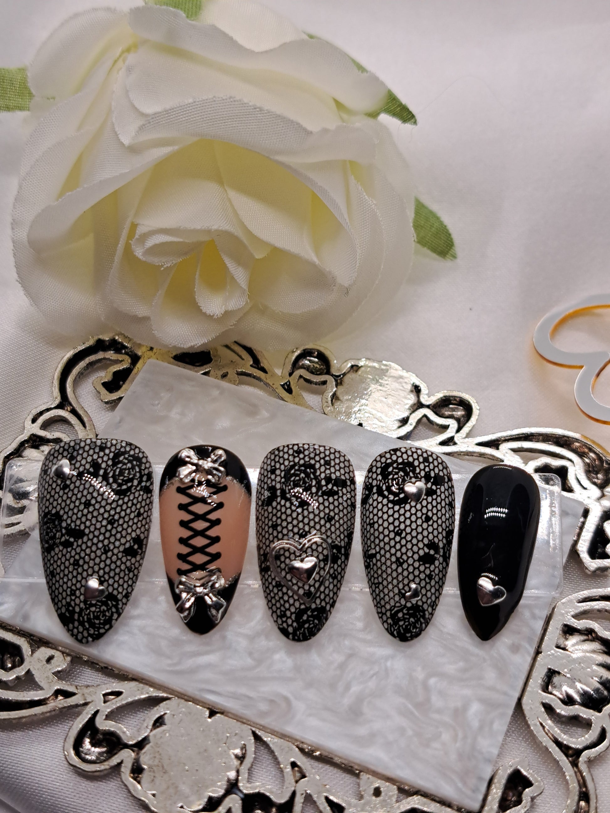 Embrace your dark side without losing your sweetness. This handcrafted press-on set features exquisite black rose lace detailing and a signature corset-tie accent nail. Adorned with 3D chrome silver hearts and silver bows, these nails are designed to give off a modern coquette romantic look with a touch of elegance. Perfect for adding a romantic flair to your daily look.
