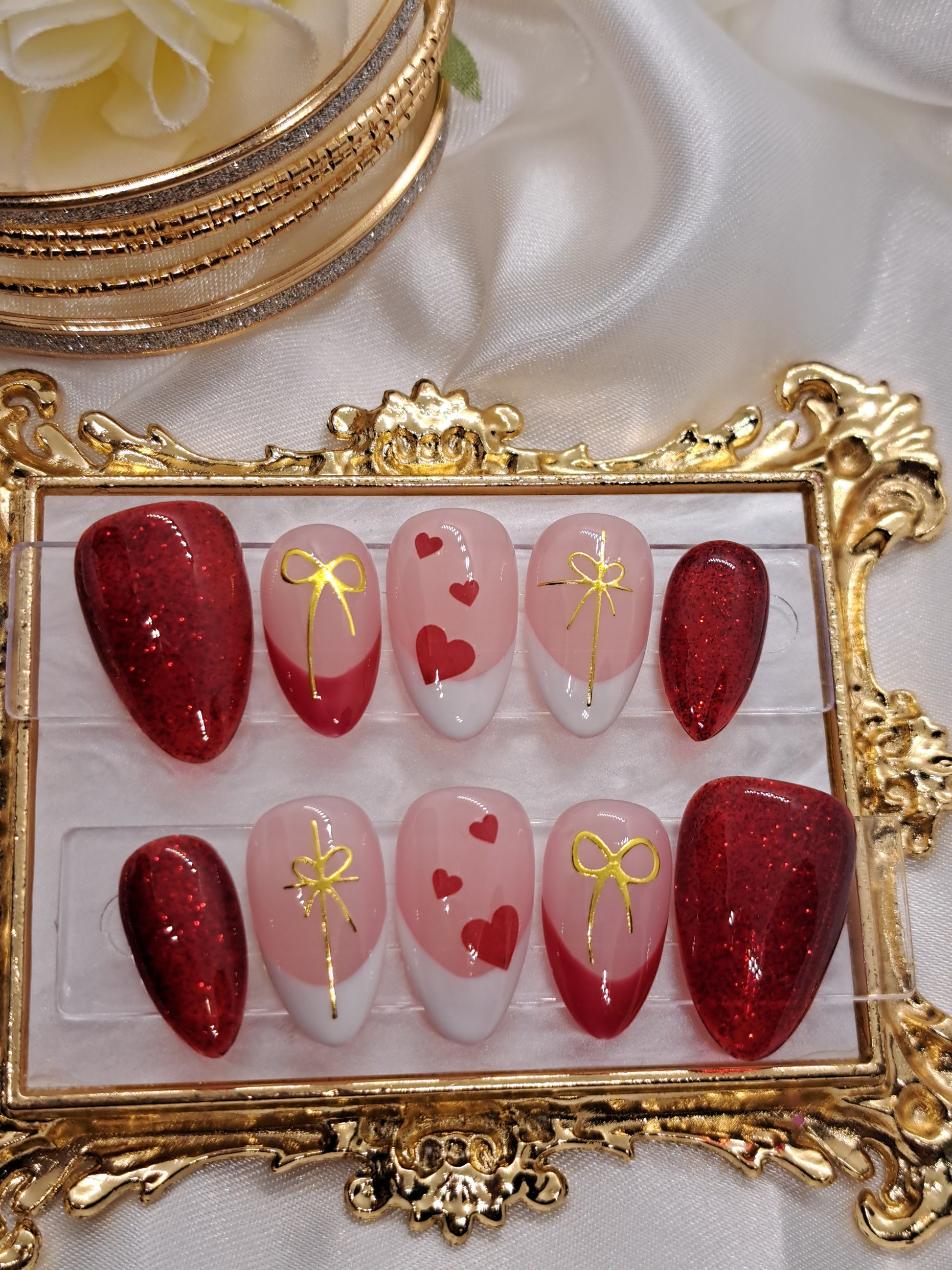 This hand-crafted press on nail set is the ultimate expression of the "Coquette" aesthetic, blending timeless romantic motifs with high-shine glamour. Featuring a sophisticated palette of ruby red glitter, soft blush pink, and crisp porcelain white, these nails are designed to make a statement for Valentine’s Day, special anniversaries, or any moment you want to feel truly "gift-wrapped💖