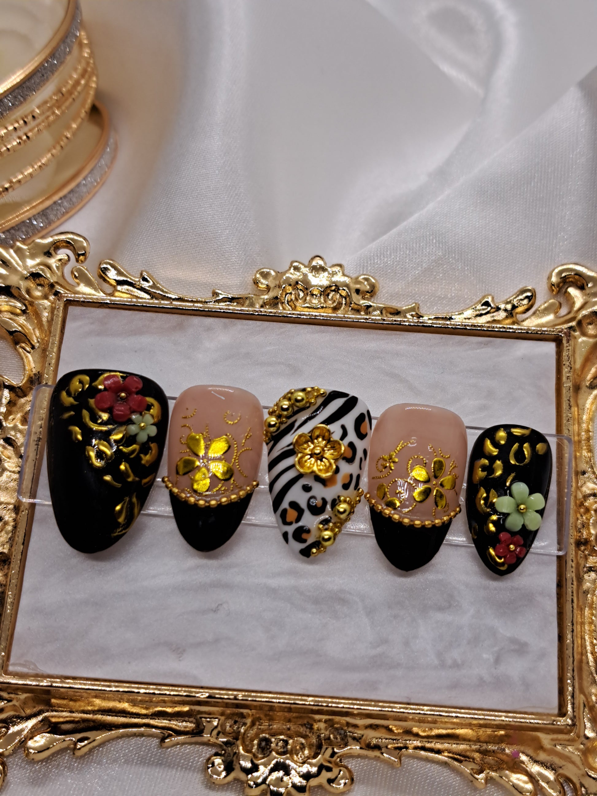 "A union of untamed power." The Chimera Lineage Bloodline represents the ultimate fusion within the BLOODLINE collection. This set is a high-contrast marriage of the sleek, monochromatic zebra and the erratic, golden leopard. Bound by heavy-relief gold scrollwork and crowned with precious crimson and jade florals, it is a tribute to a lineage that refused to choose a side—and instead, conquered both. Two worlds. One crown. Absolute hybridity.