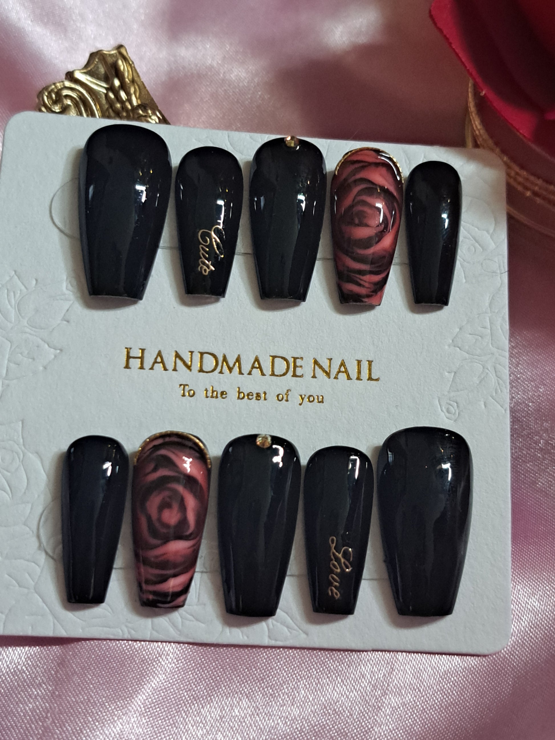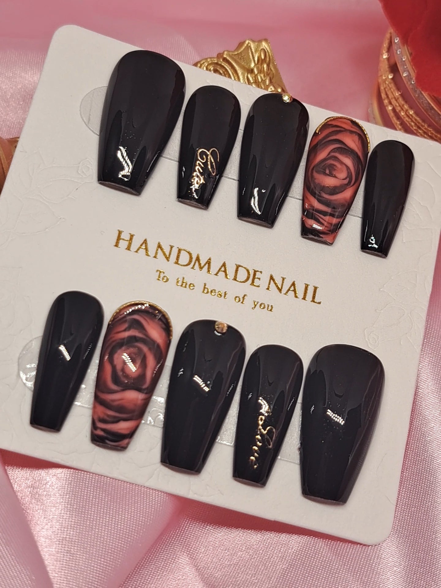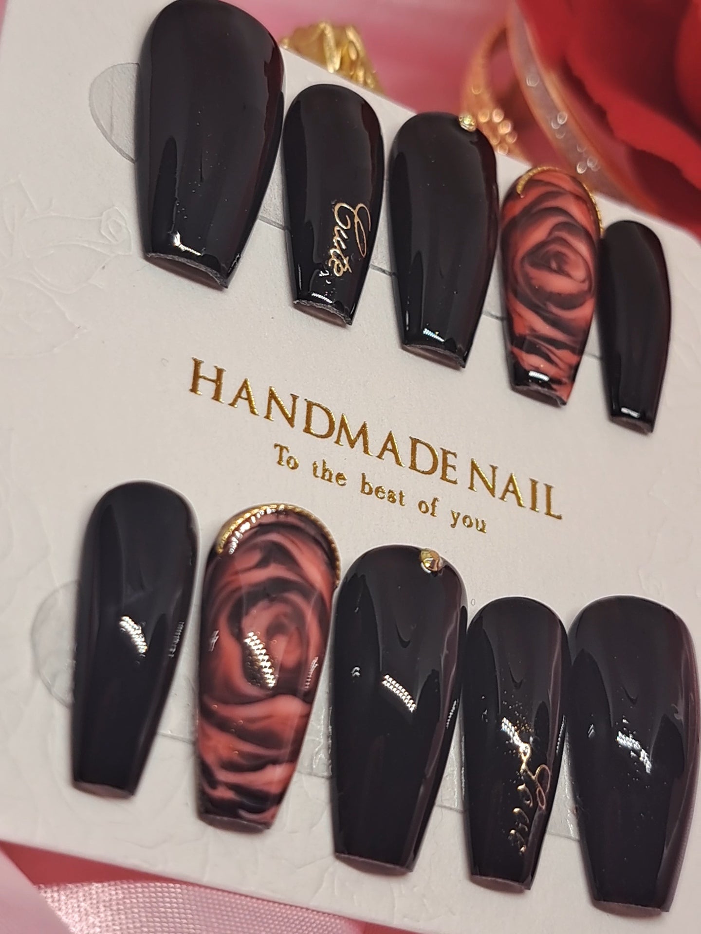 Introducing Seduction, the ultimate in luxury handmade press on nails. These black nails with a rose accent finger are the epitome of seductive beauty. With meticulous craftsmanship and alluring design, you'll captivate any onlooker. Experience the power of Seduction today.