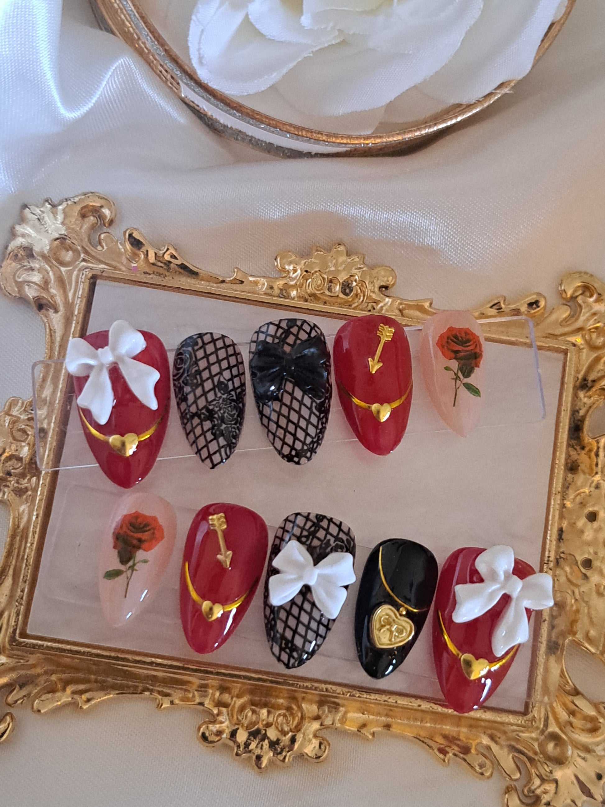 Beautiful red and black lacy press on nail set. Adorned with gold accents