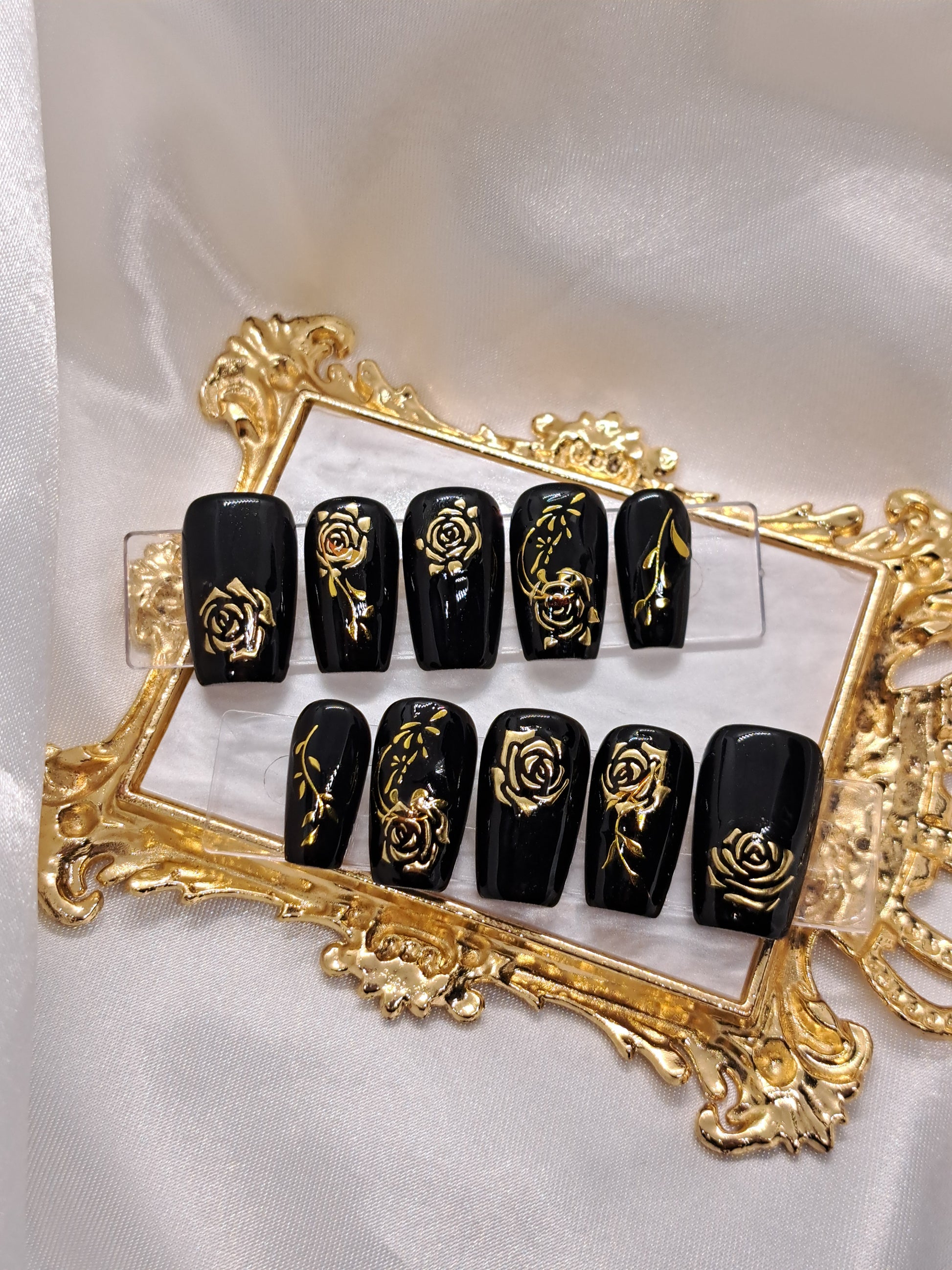 Not all roses are red. 🥀✨ Introducing: Thorns and Treasure. Where danger meets decadence. This press on nail set is for when you want to look royal but yet keep them at a distance.