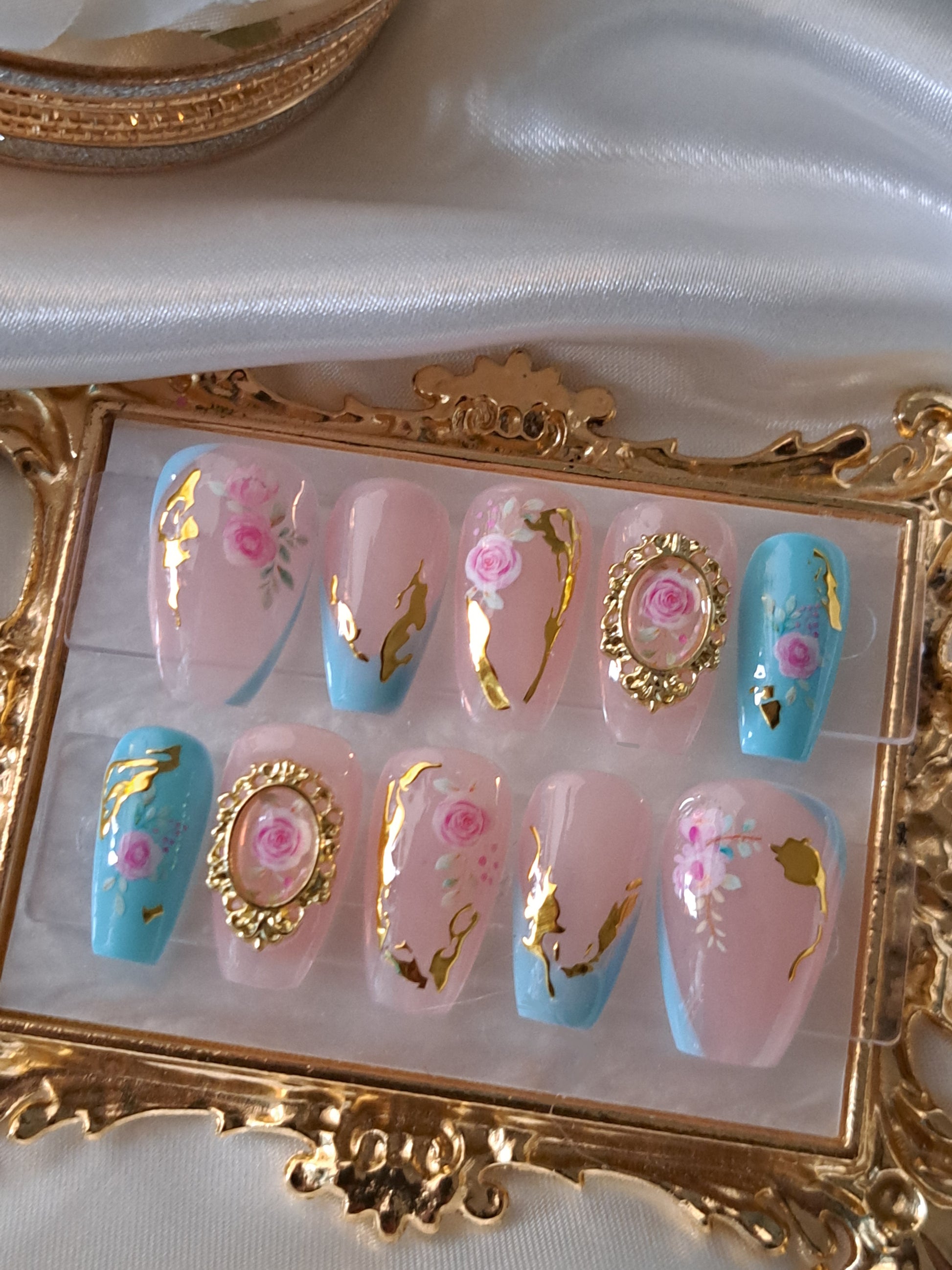 This press on nail set hits all the right notes to make you and your nails look beautiful: the Baroque gold frames, the delicate pink roses, and that regal soft blue and sheer pink palette.