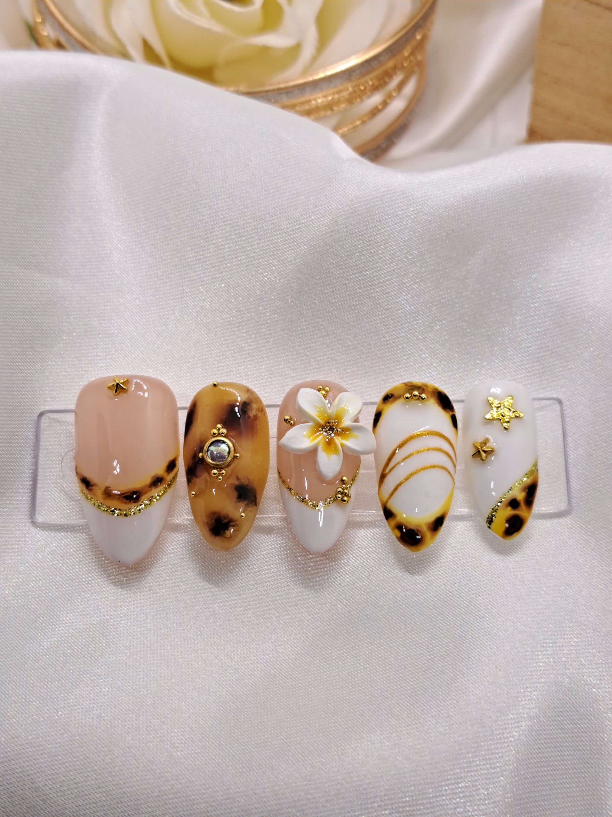 Sun-drenched luxury and heritage craftsmanship. This press on nail set features a deep, honey-glazed amber tortoiseshell pattern, balanced by a crisp alabaster base and a signature 3D floral centerpiece.